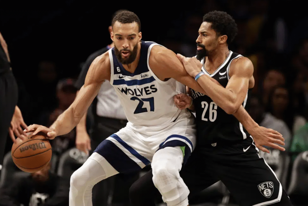 Minnesota Timberwolves center Rudy Gobert (27) drives to the basket against Brooklyn Nets guard Spencer Dinwiddie during the second half of an NBA basketball game, Tuesday, April 4, 2023, in New York.