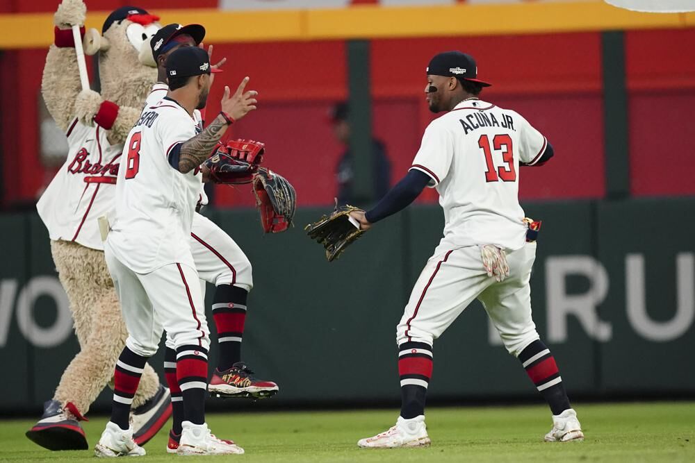 Atlanta Braves outfielders Ronald Acuña Jr. (13) Atlanta Braves Eddie Rosario (8) and Atlanta Braves Michael Harris II celebrate a win after the ninth inning in Game 2 of baseball’s National League Division Series between the Atlanta Braves and the Philadelphia Phillies, Wednesday, Oct. 12, 2022, in Atlanta. The Atlanta Braves won 3-0.
